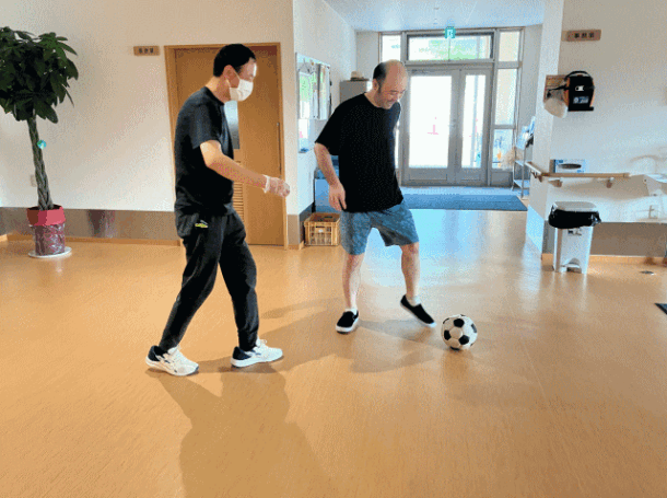 外は気温が高かった日に玄関前でボールを蹴って身体を動かしていました。